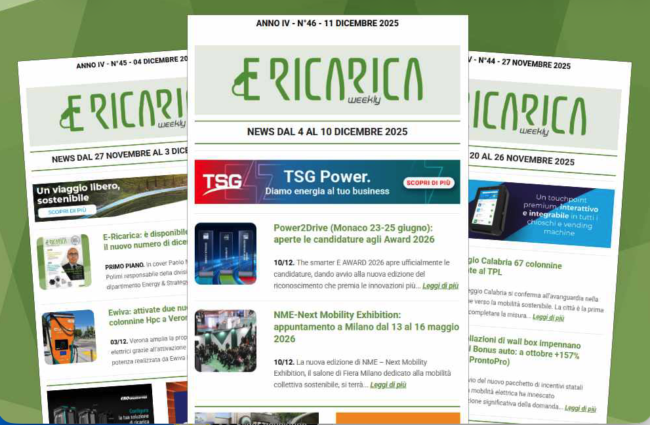 Nuovo numero di E-Ricarica Weekly, la newsletter della testata di Editoriale Farlastrada dedicata alla mobilità elettrica, è disponibile