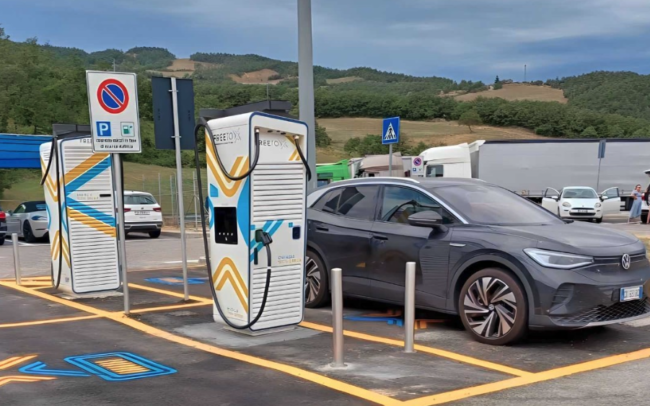 La stazione inaugurata da Free To X prevede 4 charging point Hpc con stalli passanti per agevolare la ricarica anche dei mezzi con rimorchio.