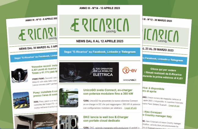 Il nuovo numero di E-Ricarica Weekly la newsletter della testata di Editoriale Farlastrada dedicata alla mobilità elettrica, è disponibile.