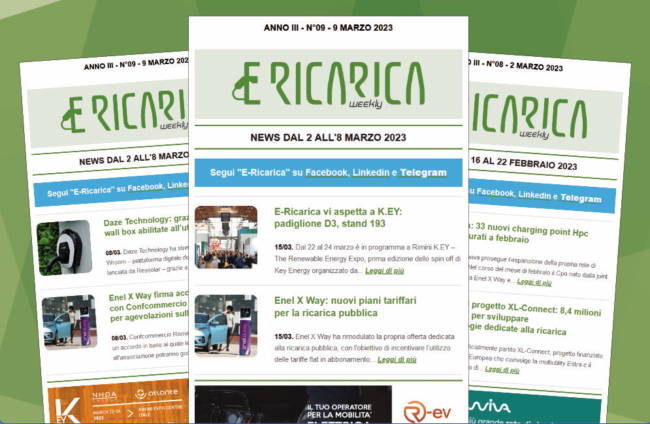 Il nuovo numero di E-Ricarica Weekly la newsletter della testata di Editoriale Farlastrada dedicata alla mobilità elettrica, è disponibile.