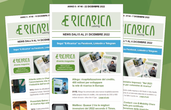 Il nuovo numero di E-Ricarica Weekly la newsletter della testata di Editoriale Farlastrada dedicata alla mobilità elettrica, è disponibile.