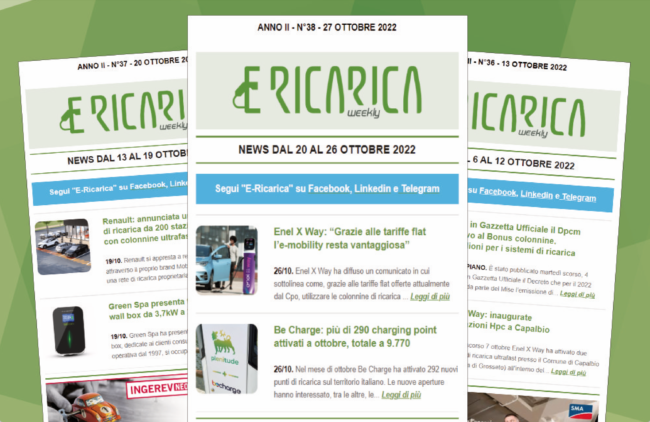 Il nuovo numero di E-Ricarica Weekly la newsletter della testata di Editoriale Farlastrada dedicata alla mobilità elettrica, è disponibile.