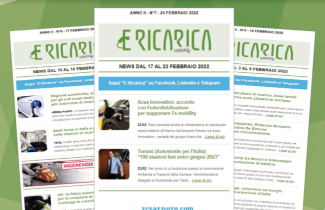 Il nuovo numero di E-ricarica Weekly la newsletter della testata di Editoriale Farlastrada dedicata alla mobilità elettrica, è disponibile.