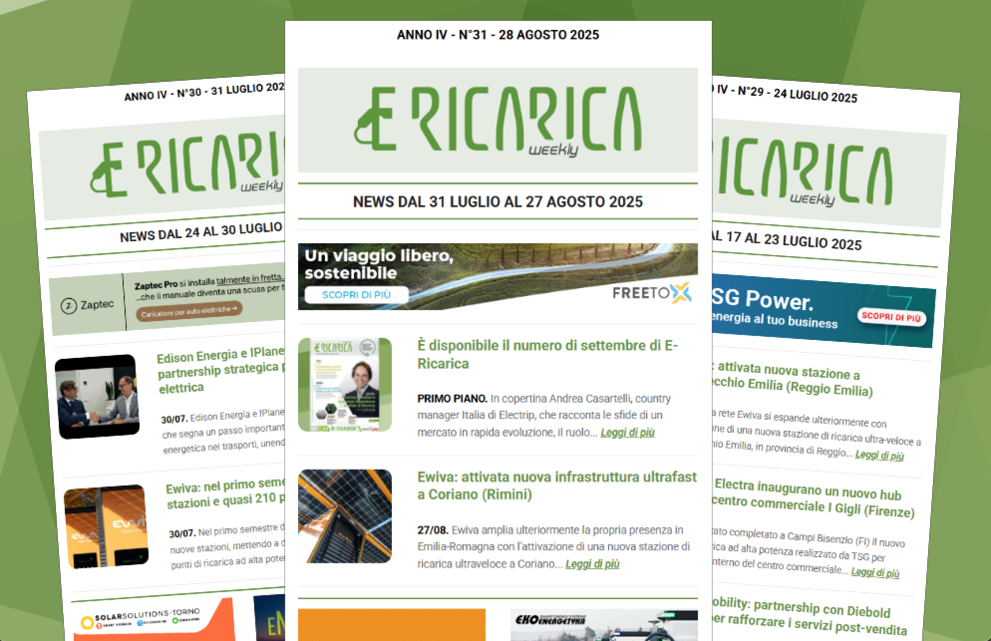 All’interno della newsletter: il numero di settembre di E-Ricarica dedica la coverstory ad Andrea Casartelli, country manager di Electrip, Ewiva inaugura una nuova stazione ultrafast in Emilia-Romagna, al via gli incentivi per l'acquisto di auto elettriche: stanziati 597 milioni di euro. Agcm multa Enel X per 2,3 milioni di euro, IPlanet attiva due nuove infrastrutture in provincia di Bergamo, Marika Chiaromonte nominata sales director di Senec Italia.