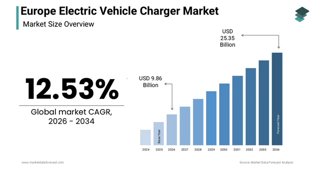 Il mercato europeo delle infrastrutture di ricarica per veicoli elettrici si conferma in forte espansione, sostenuto dalla combinazione di obblighi normativi, crescita della domanda di mobilità elettrica e investimenti nella rete energetica. Secondo una ricerca effettuata da Market Data Forecast, Nel 2025 il valore del mercato è stimato in 8,76 miliardi di dollari, con una previsione di crescita fino a 9,86 miliardi nel 2026 e un incremento atteso fino a 25,35 miliardi entro il 2034, con un tasso di crescita annuo composto del 12,53% nel periodo di previsione.