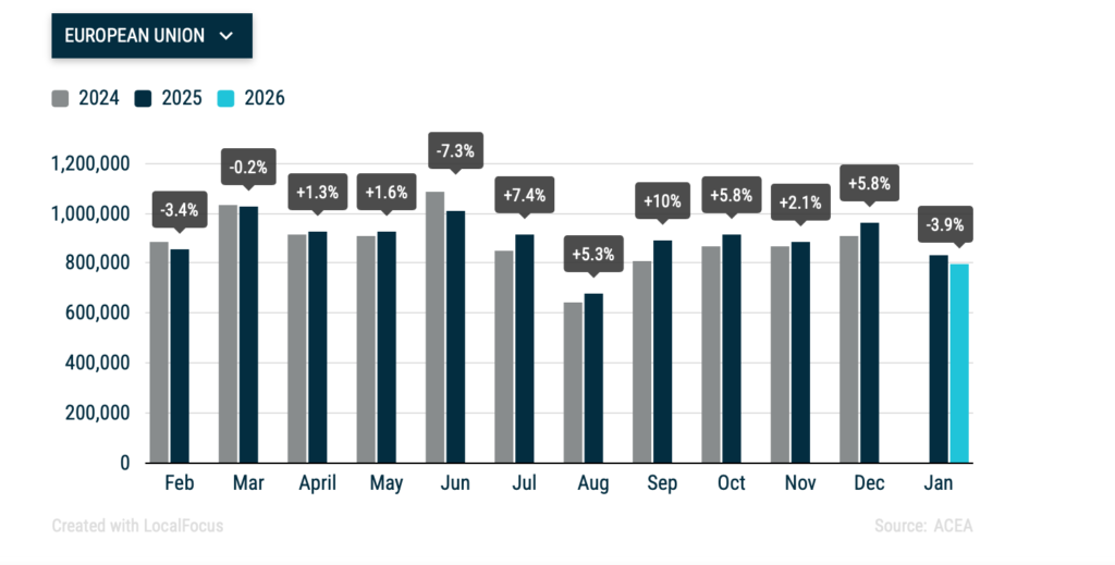 Le auto elettriche a batteria continuano a guadagnare terreno nel mercato europeo. A gennaio 2026, secondo i dati pubblicati da Acea, le nuove immatricolazioni di veicoli BEV hanno raggiunto una quota del 19,3%, in netto aumento rispetto al 14,9% dello stesso mese del 2025, confermando un potenziale di crescita ancora significativo nonostante il rallentamento generale del mercato. Nel primo mese dell’anno, nell’Unione europea sono state registrate 154.230 nuove auto elettriche a batteria, mentre le immatricolazioni complessive di autovetture sono diminuite del 3,9% su base annua, segnando il secondo avvio d’anno consecutivo in territorio negativo.