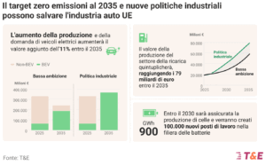 Mentre l’abbandono di tale target potrebbe comportare perdite economiche e occupazionali, il suo mantenimento, supportato da politiche industriali efficaci, offre l’opportunità di rilanciare il settore, creare nuovi posti di lavoro e contribuire alla crescita economica sostenibile. Per l’Italia secondo T&E questa è un’occasione per consolidare la propria posizione nel panorama automobilistico europeo e globale, investendo in innovazione, sostenibilità e sviluppo delle competenze.